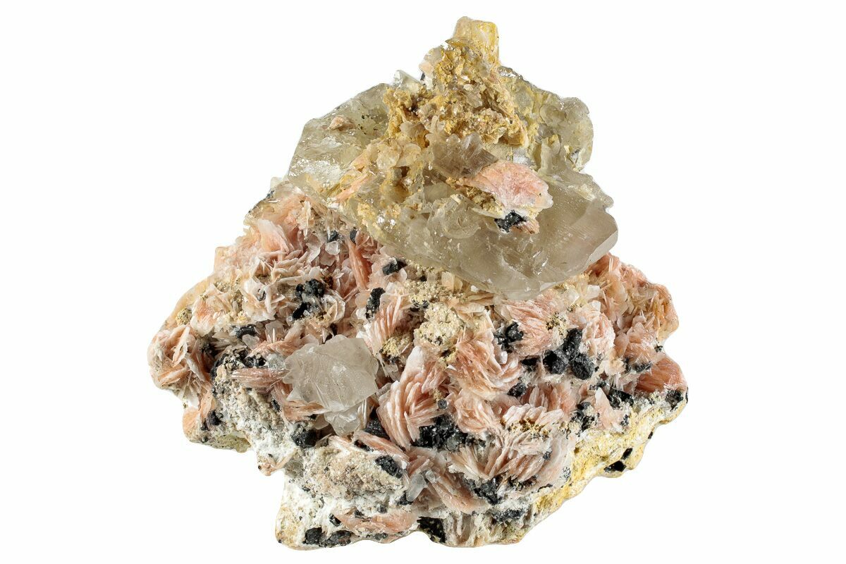 This is an association of cerussite crystals and salmon-pink bladed barite, both of which formed on a galena-encrusted matrix. This mineral association was collected from the Les Dalles Mine in Mibladen, Morocco. The cerussite fluoresces a vibrant white-yellow color under short-wave UV light.
