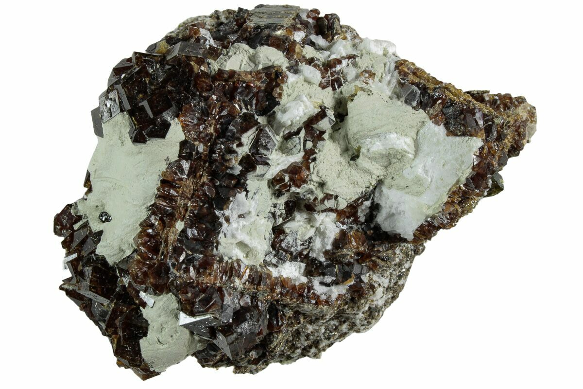 This garnet centered specimen comes from a location in Pakistan, where associations of deep orange/brown garnets, feldspar, golden mica, green epidote, calcite and albite are typically found. The garnets from this location display a unique pattern, which can be seen along the faces of the crystals when rotated under light.
