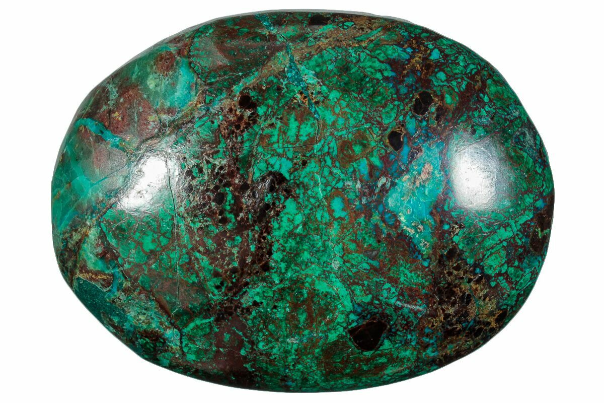 Regularly, chrysocolla will form as botryoidal lumps and spheres, rarely forming visible crystals. It can also form in both solid and fibrous veins, over fibrous minerals, and in crusts. Known for its sharp and vibrant coloring, chrysocolla can display a wide variety of colors such as bluish-green, bright green, light blue, to even sometimes multicolored specimens depending on the atmosphere present during formation.