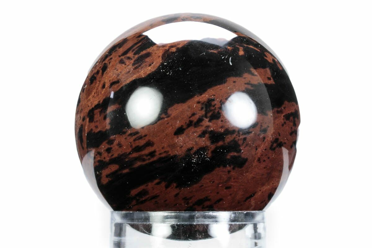 This is a 2.55" wide mahogany obsidian sphere, likely collected from California. This obsidian specimen has been flawlessly polished, revealing the swirls and streaks of red/orange color that give this form of obsidian its name.