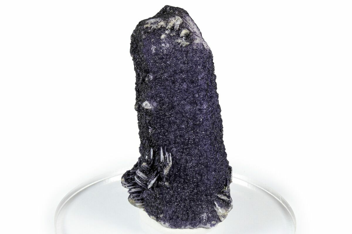 This fascinating specimen represents a new find from the renowned Huanggang Mines of Inner Mongolia. It features a thin layer of purple fluorite overlying a 2.55" long quartz crystal. The specimen is accompanied by an acrylic display base and mineral tack.