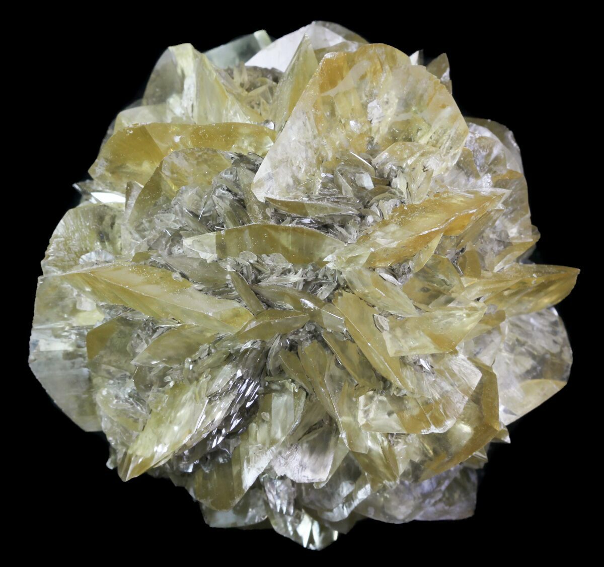 This is a classic Canadian mineral specimen from the Red River Floodway deposits in Manitoba, Canada. It's a selenite ball covered in gemmy, pale yellow, selenite crystals. The entire piece measures 2.55" wide. The crystals are highly fluorescent under short wave UV, and emits phosphorescent light that remains several seconds after the UV light is turned off.