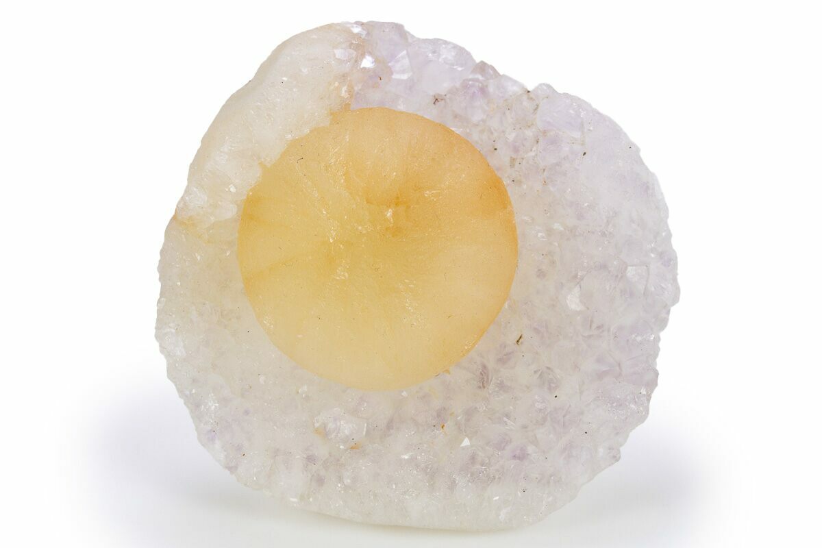 This is a high-quality, unique formation of yellow-orange fluorite, collected from Madhya Pradesh, India. It formed in botryoidal fashion over a bed of quartz/amethyst crystals and chalcedony.