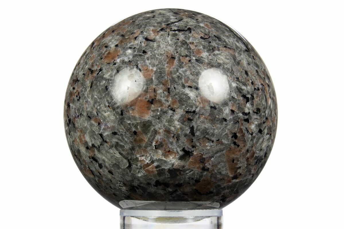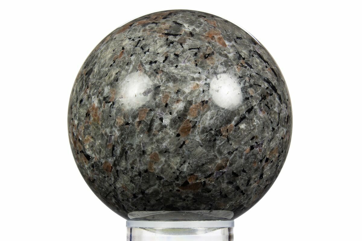 This is a gorgeous, 2.6" wide, hand-polished sphere of sodalite-syenite, collected from a mine in China. While having the same composition of Yooperlite, only specimens from Michigan can truly be considered Yooperlite. Sodalite-Syenite from China and Greenland look quite similar and exhibit phenomenal fluorescence. Under both short and long-wave UV, portions of this sphere fluoresce a vibrant yellow-orange-red. A photo of this sphere under UV light can be seen above.