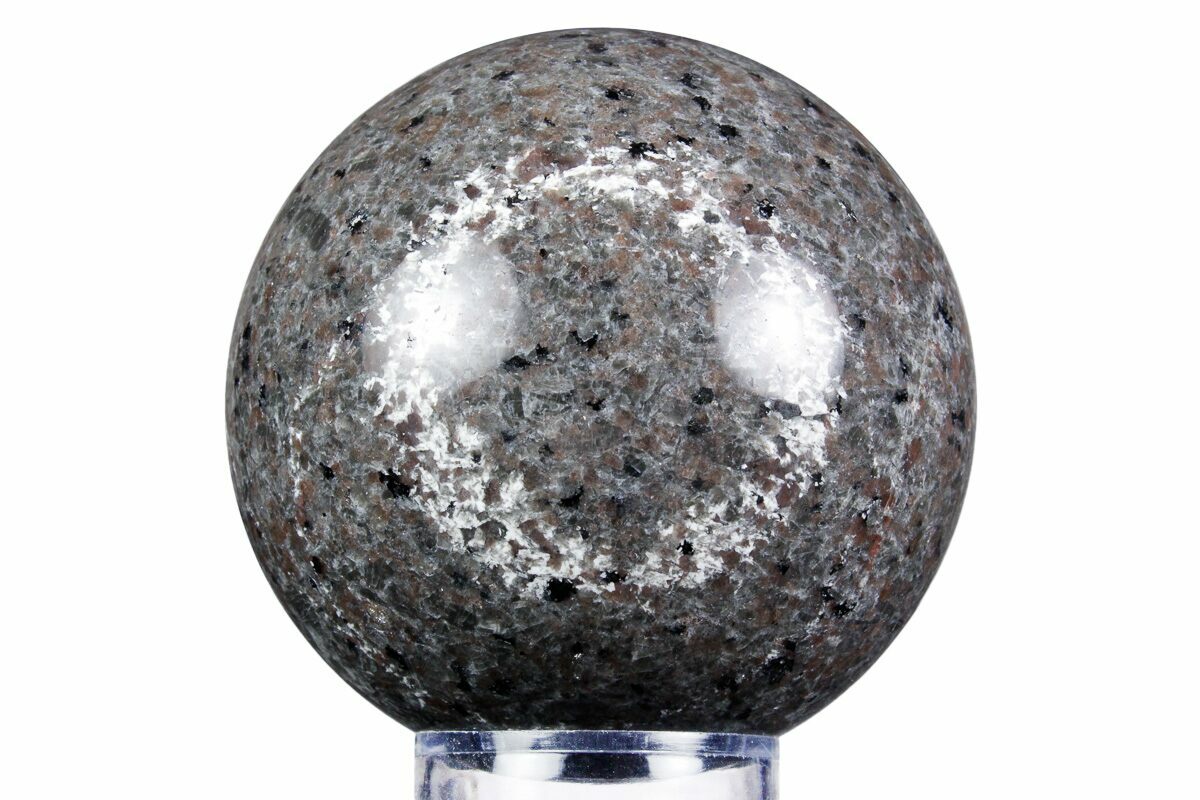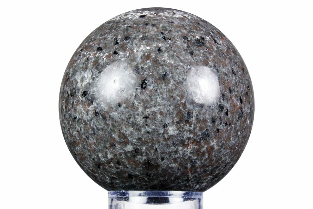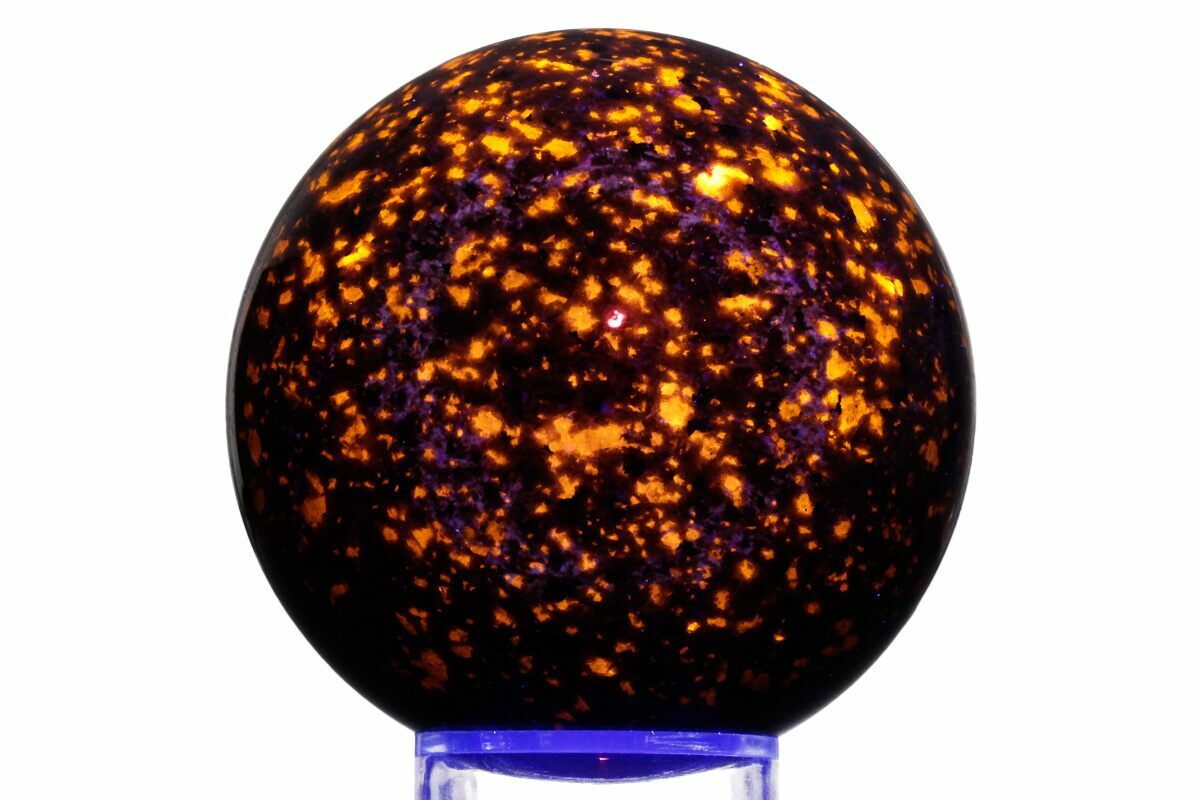 This is a gorgeous, 2.6" wide, hand-polished sphere of sodalite-syenite, collected from a mine in China. While having the same composition of Yooperlite, only specimens from Michigan can truly be considered Yooperlite. Sodalite-Syenite from China and Greenland look quite similar and exhibit phenomenal fluorescence. Under both short and long-wave UV, portions of this sphere fluoresce a vibrant yellow-orange-red. A photo of this sphere under UV light can be seen above.