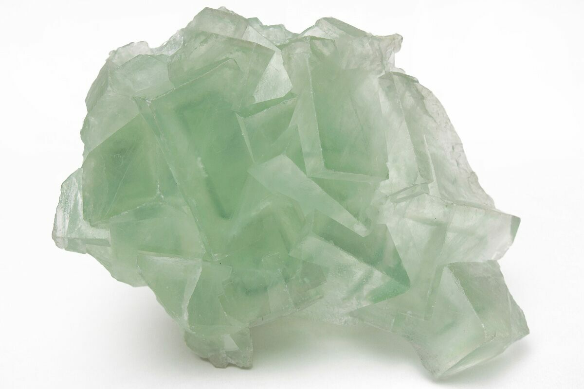 This is an aggregation of exceptionally beautiful cubic fluorite crystals with light-green coloration. Each crystal contains an internal "phantom" growth zone with deep-green coloration. It comes out of the Hunan Province of China, a region known for its stunning fluorite formations. The crystals are in excellent condition with only some minor chipping to edges, and typical damage along the periphery and underside of the specimen where it was removed from the pocket.