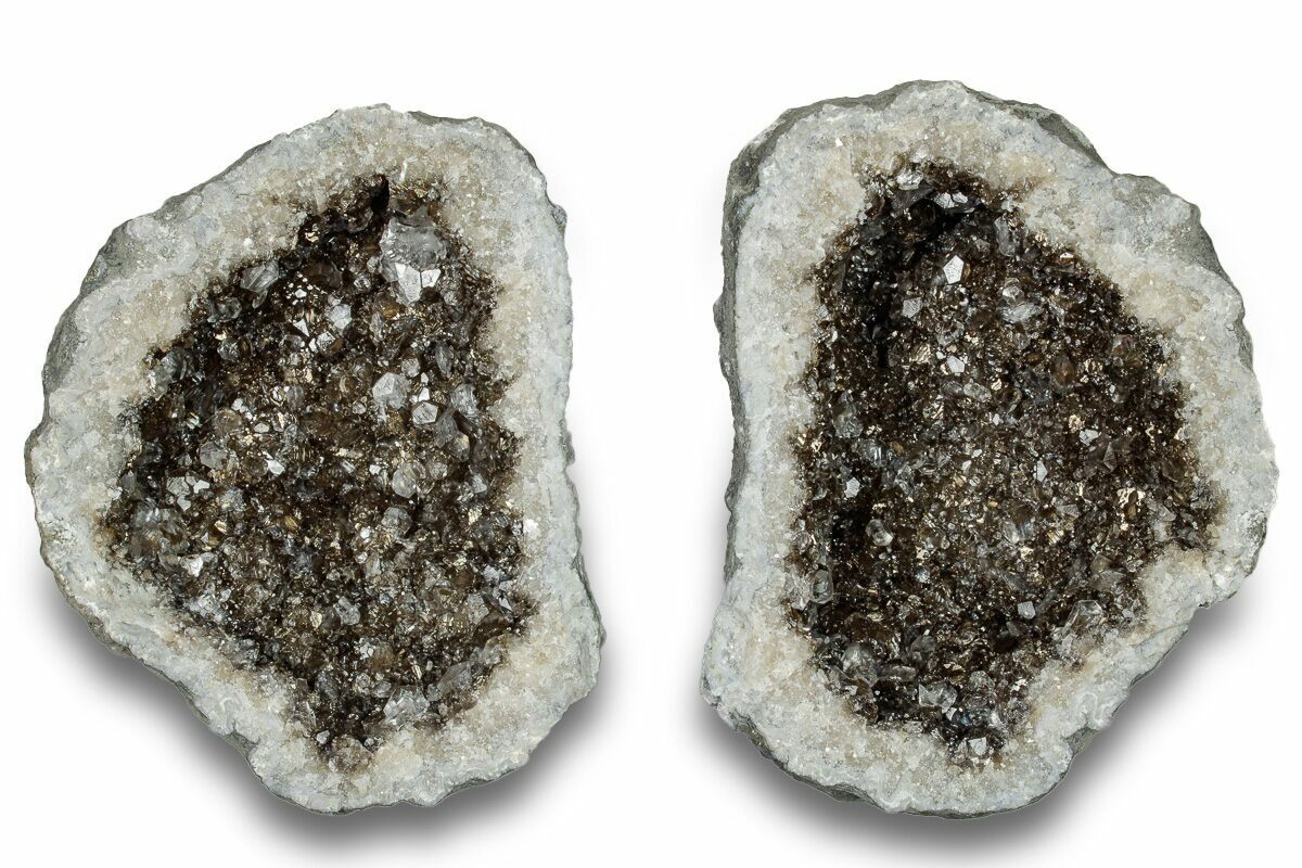 This is a sparkling 2.6" wide keokuk geode collected from Lewis County, Missouri. It has been cracked open to reveal an interior lined with sparkling clear and brown calcite crystals. Both halves are included with this purchase.