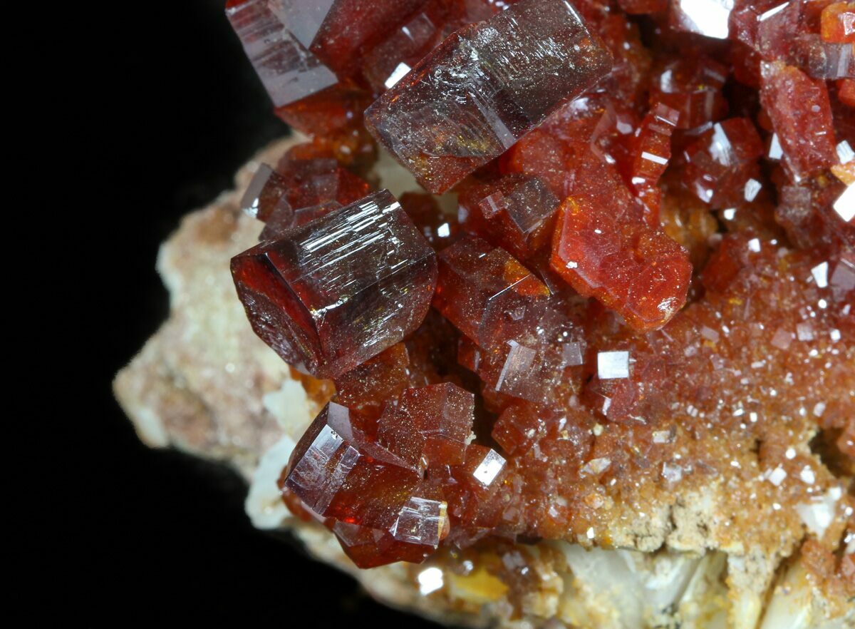 Vanadinite from Morocco is world-famous for producing some of the finest red crystal specimens on the planet. In the arid hills surrounding Mibladen and Taouz, vanadinite forms as vibrant clusters of hexagonal prisms, often with a deep crimson to orange-red color that seems to glow against the pale desert matrix. These crystals typically develop in dense groups, coating barite blades or covering weathered limestone with dazzling, glassy faces and sharp geometric symmetry. The dryness of the region and the slow oxidation of ancient lead deposits create the perfect geochemical environment for vanadinite to grow with exceptional clarity, luster, and intensity of color. Moroccan vanadinite is highly prized by collectors for its bold aesthetics, architectural crystal formations, and the consistent quality that has made these localities the global benchmark for the species.