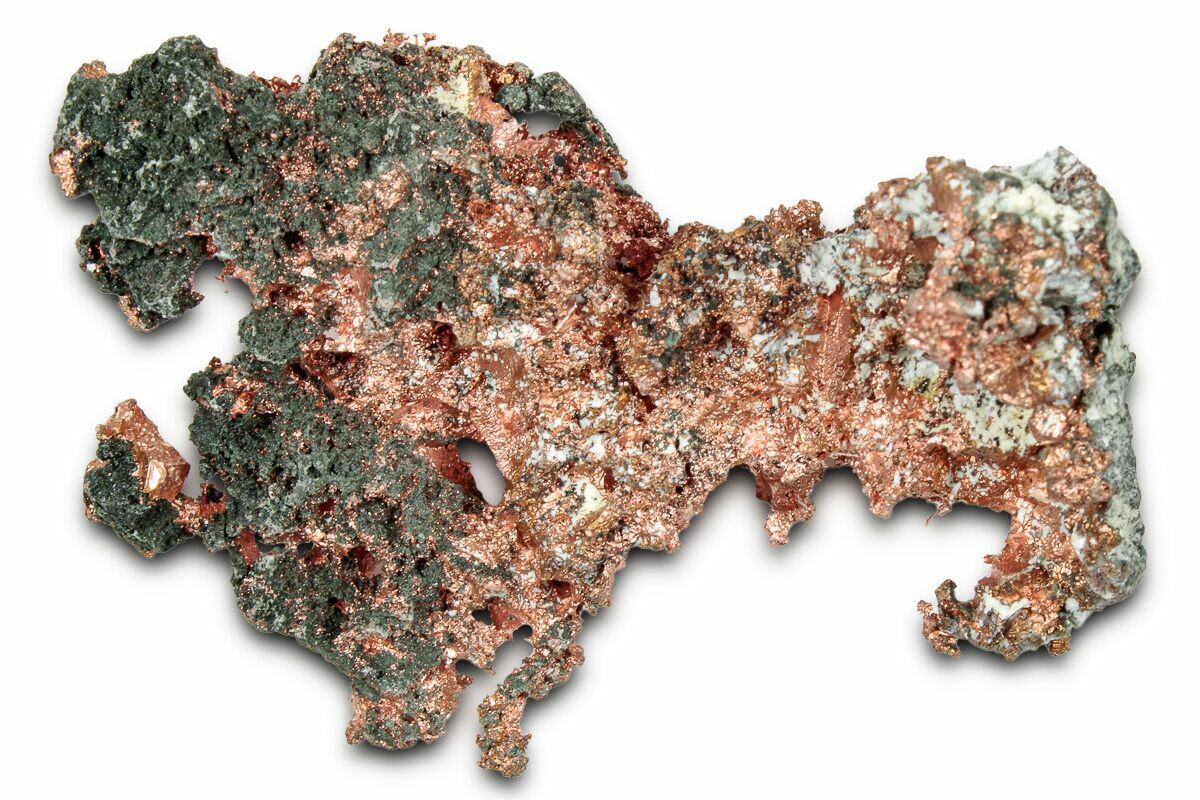 Native copper occurs rarely as isometric cubic and octahedral crystals, but more typically as irregular masses and fracture fillings. It has a reddish, orangish, and/or brownish color on fresh surfaces, but typically is weathered and coated with a green tarnish of copper carbonate.