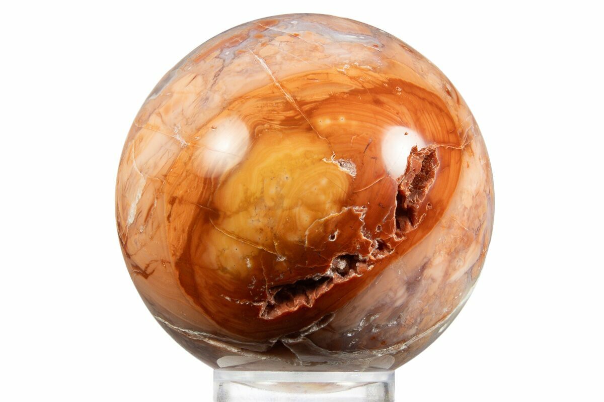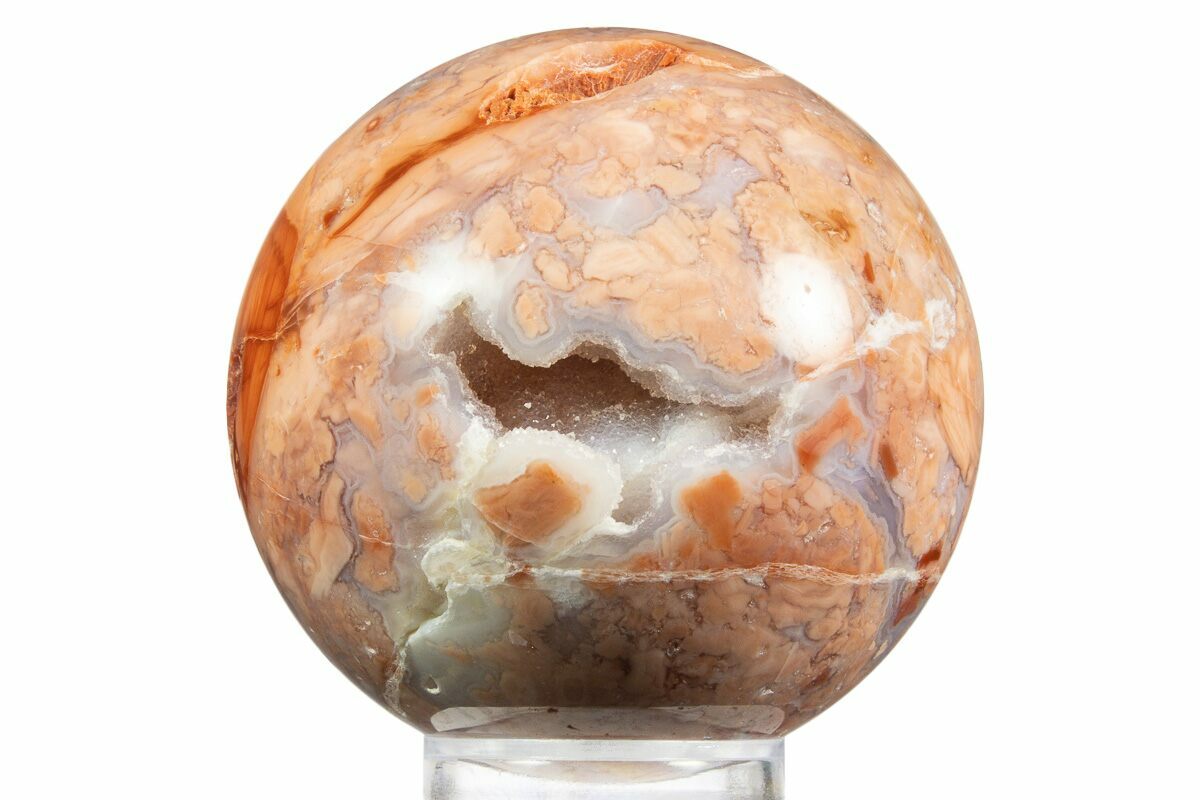 This is a 2.6" wide, dreamy, pink/red/white polished sphere of cotton candy agate from Mexico. A quartz crystal encrusted pocket can be found along one side of the sphere. It comes with an acrylic display stand.