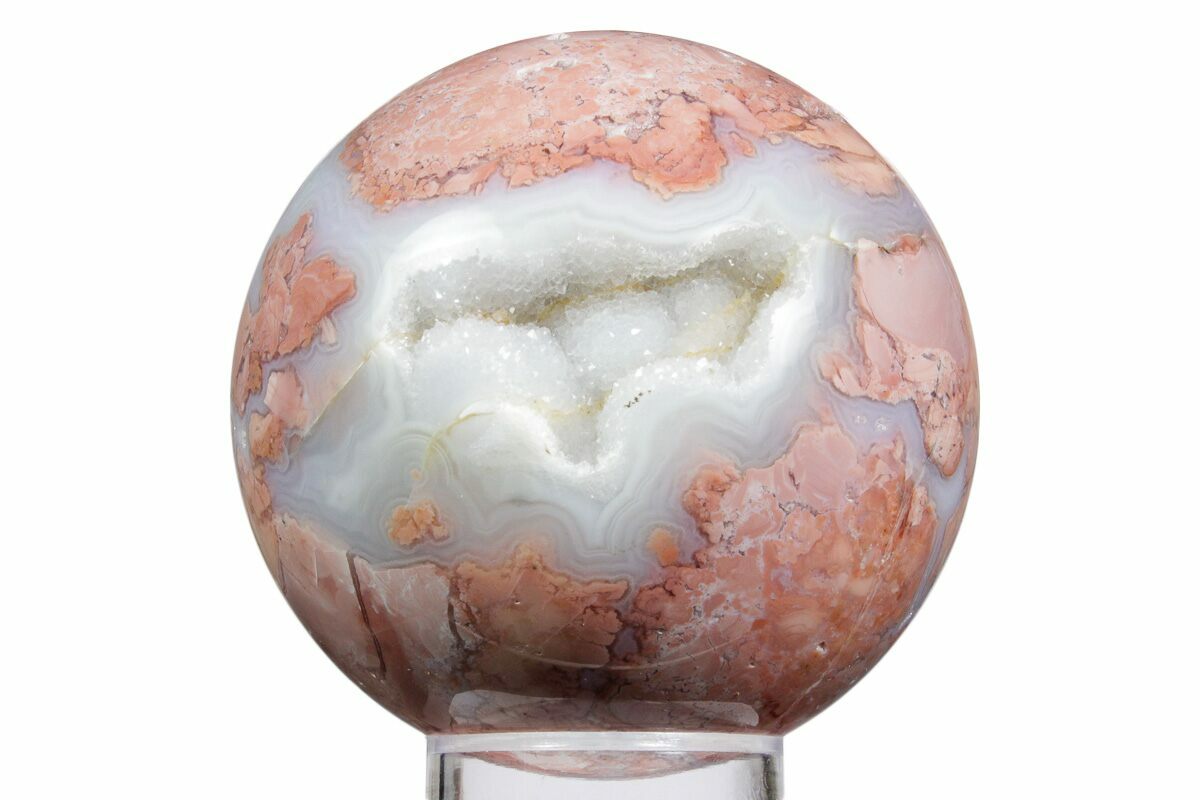 This is a 2.6" wide, dreamy, pink/red/white polished sphere of cotton candy agate from Mexico. A quartz crystal encrusted pocket can be found along one side of the sphere. It comes with an acrylic display stand.