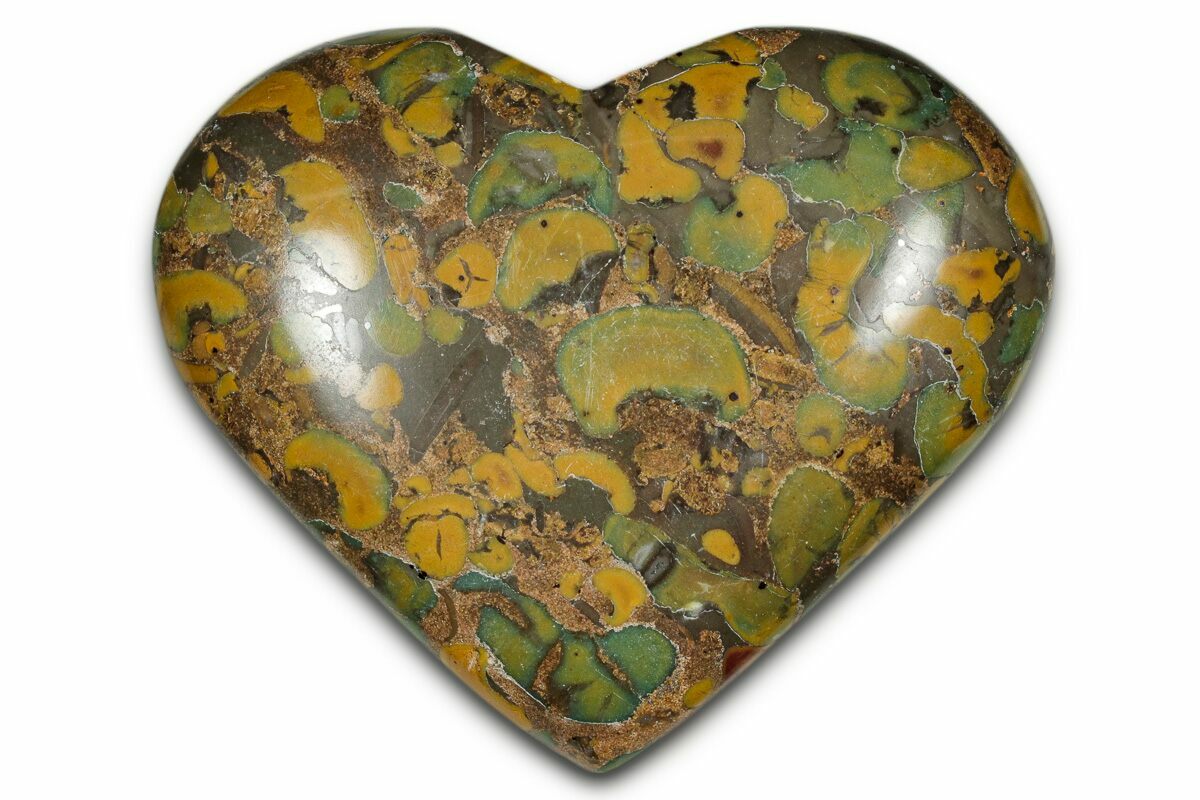 This is a beautifully polished, 2.6" wide fruit jasper heart. Its smooth finish and eye-catching color palette make it a small yet stunning display piece.