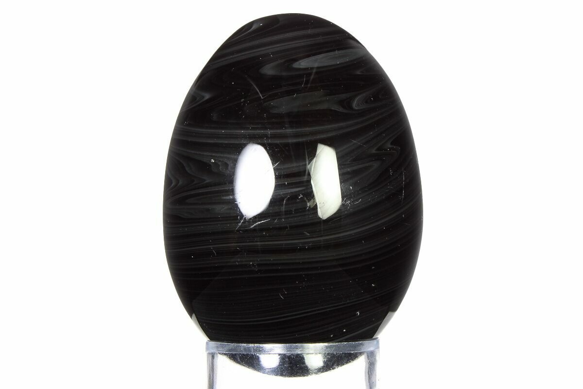 This is a 2.6" tall egg made from silver sheen obsidian collected from outside Guadalajara, Mexico. The silver sheen can be found across the egg. This obsidian specimen has been polished to a mirror finish and comes with the pictured display stand.
