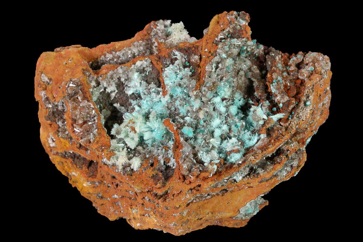 Aurichalcite (chemical formula (Zn,Cu)5(CO3)2(OH)6) is a secondary mineral that forms in the oxidation zones of copper and zinc ore deposits. It often forms as radiating, fuzzy-looking acicular blue-green crystals and linings along cavity walls.