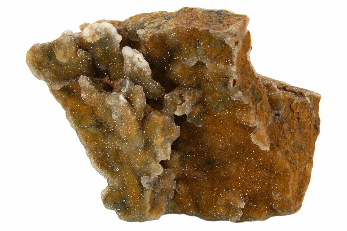 This is a 2.6" wide rock that is encrusted in a layer of chalcedony. It was collected from the Chromite Mine which is located in the Bursa Province of Turkey. The presence of chromium and iron within the underlying rock, gives the specimen its green and orange coloration.