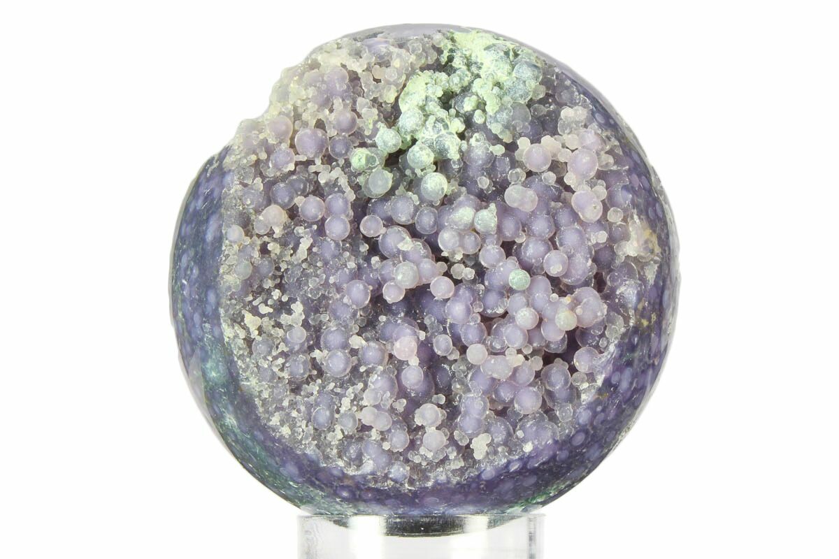 This is a 2.6" wide purple & green grape agate sphere from Sulawesi, Indonesia. It has been polished into a sphere shape with one side left in its natural form. The natural side shows sparkling purple chalcedony formations and a botryoidal structure from which it earned its name.