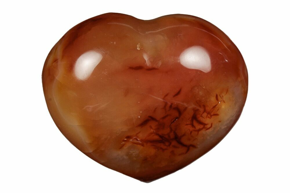 This is a richly colored piece of carnelian agate, polished into the shape of a heart. The carnelian is mined in Madagascar and has wonderful deep red and orange colors.