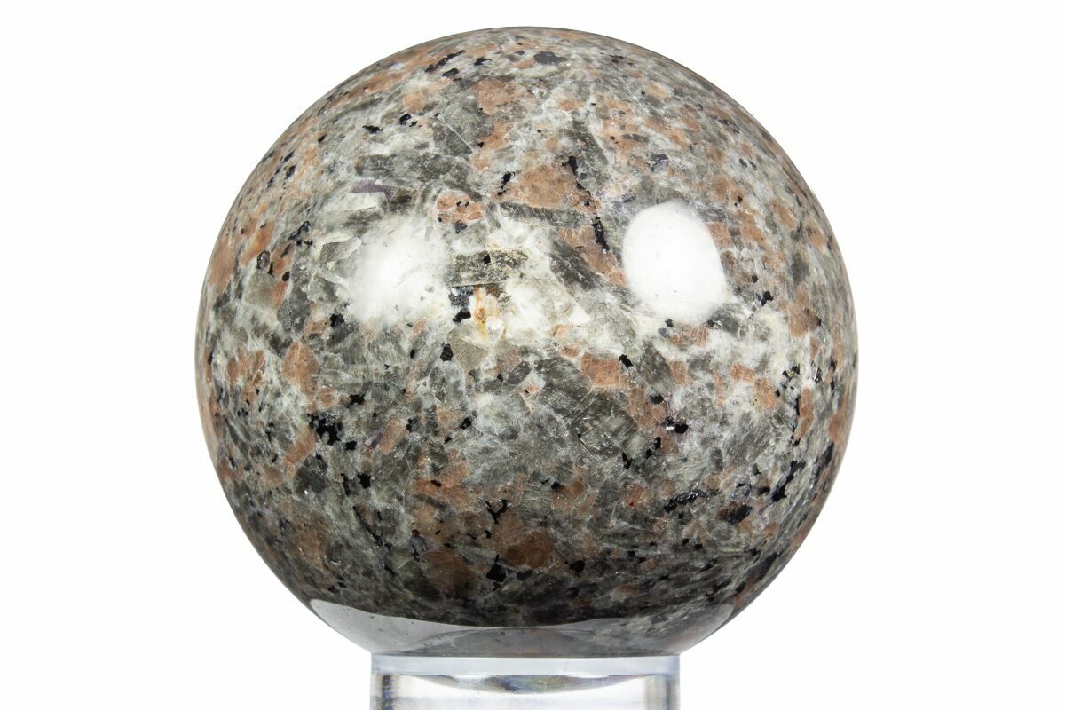 This is a gorgeous, 2.65" wide, hand-polished sphere of sodalite-syenite, collected from a mine in China. While having the same composition of Yooperlite, only specimens from Michigan can truly be considered Yooperlite. Sodalite-Syenite from China and Greenland look quite similar and exhibit phenomenal fluorescence. Under both short and long-wave UV, portions of this sphere fluoresce a vibrant yellow-orange-red. A photo of this sphere under UV light can be seen above.