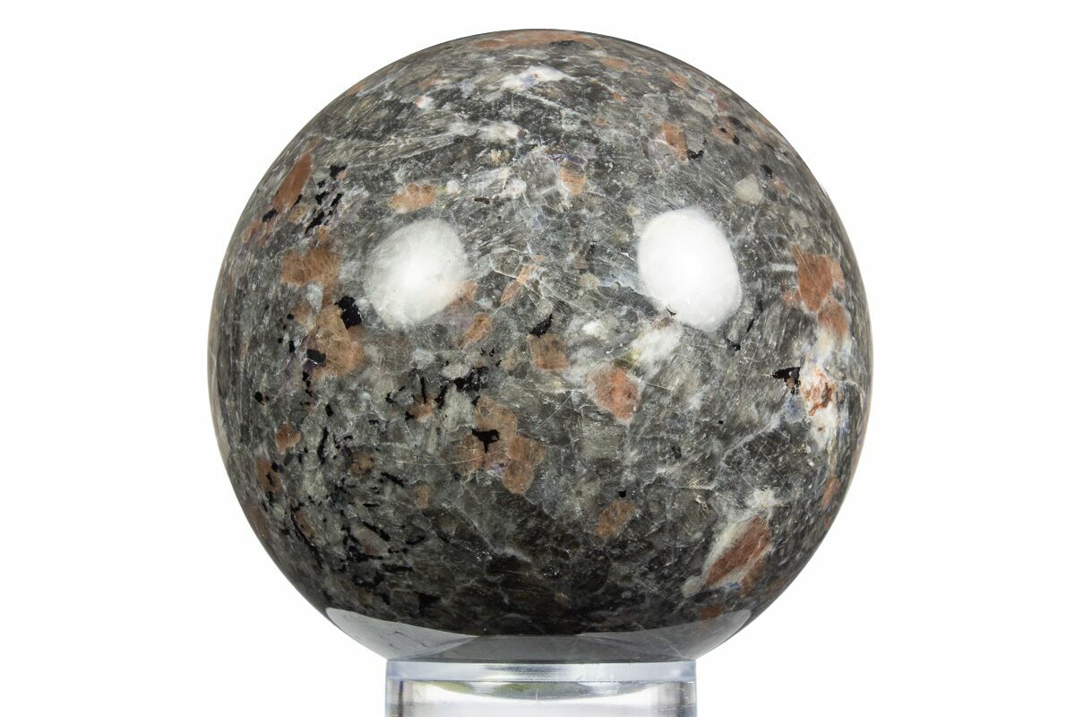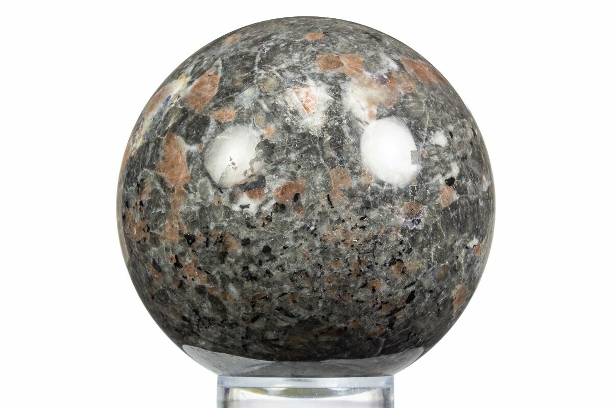 This is a gorgeous, 2.65" wide, hand-polished sphere of sodalite-syenite, collected from a mine in China. While having the same composition of Yooperlite, only specimens from Michigan can truly be considered Yooperlite. Sodalite-Syenite from China and Greenland look quite similar and exhibit phenomenal fluorescence. Under both short and long-wave UV, portions of this sphere fluoresce a vibrant yellow-orange-red. A photo of this sphere under UV light can be seen above.