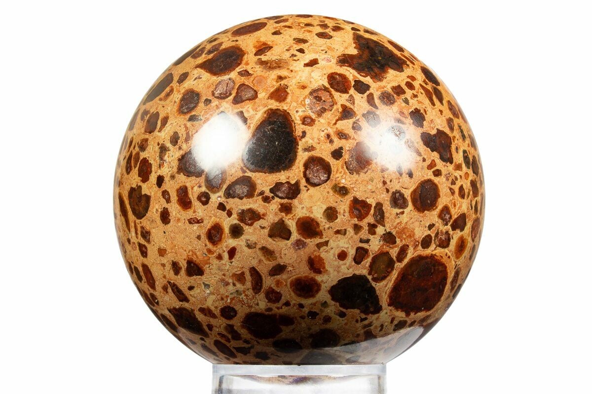 This is an incredible polished sphere made of bauxite (aluminum ore) mined in Russia. It is old collection material that was provided in its rough form and later polished to a glossy-finish. The polish brings out the spherical, red-brown ore bodies which contrast beautifully against the beige matrix. Seldom is this beautiful material found on the market.