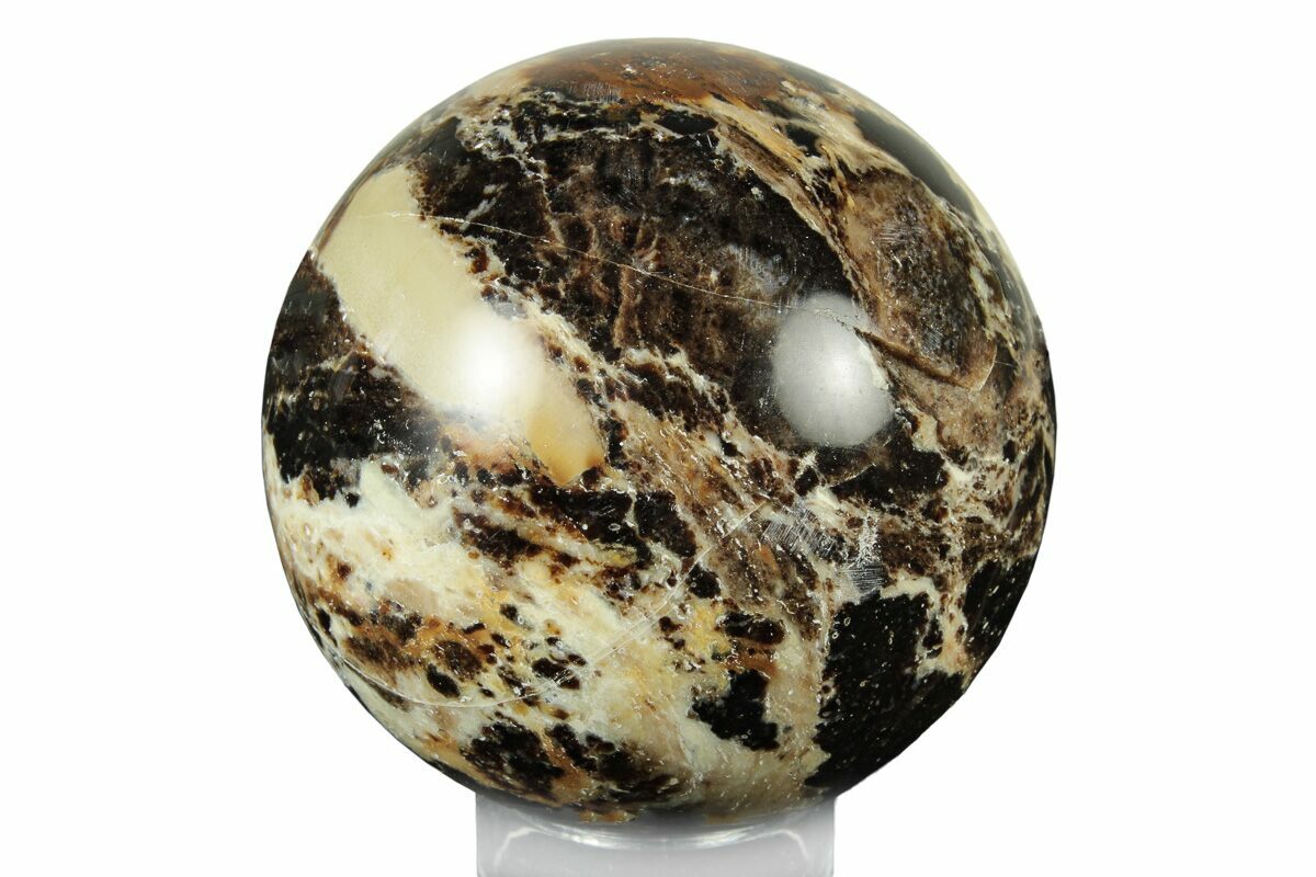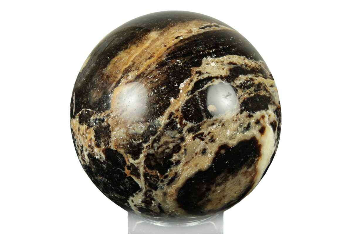This is a 2.65" black opal sphere crafted in Madagascar. Comes with an acrylic ring stand. This specimen comes at a reduced price due to some chip damage.