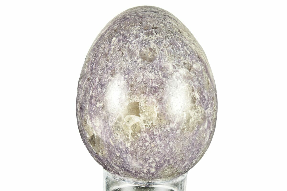This is a 2.65" tall, polished egg of purple lepidolite from Madagascar. It comes with an acrylic ring display stand for secure, aesthetic display.