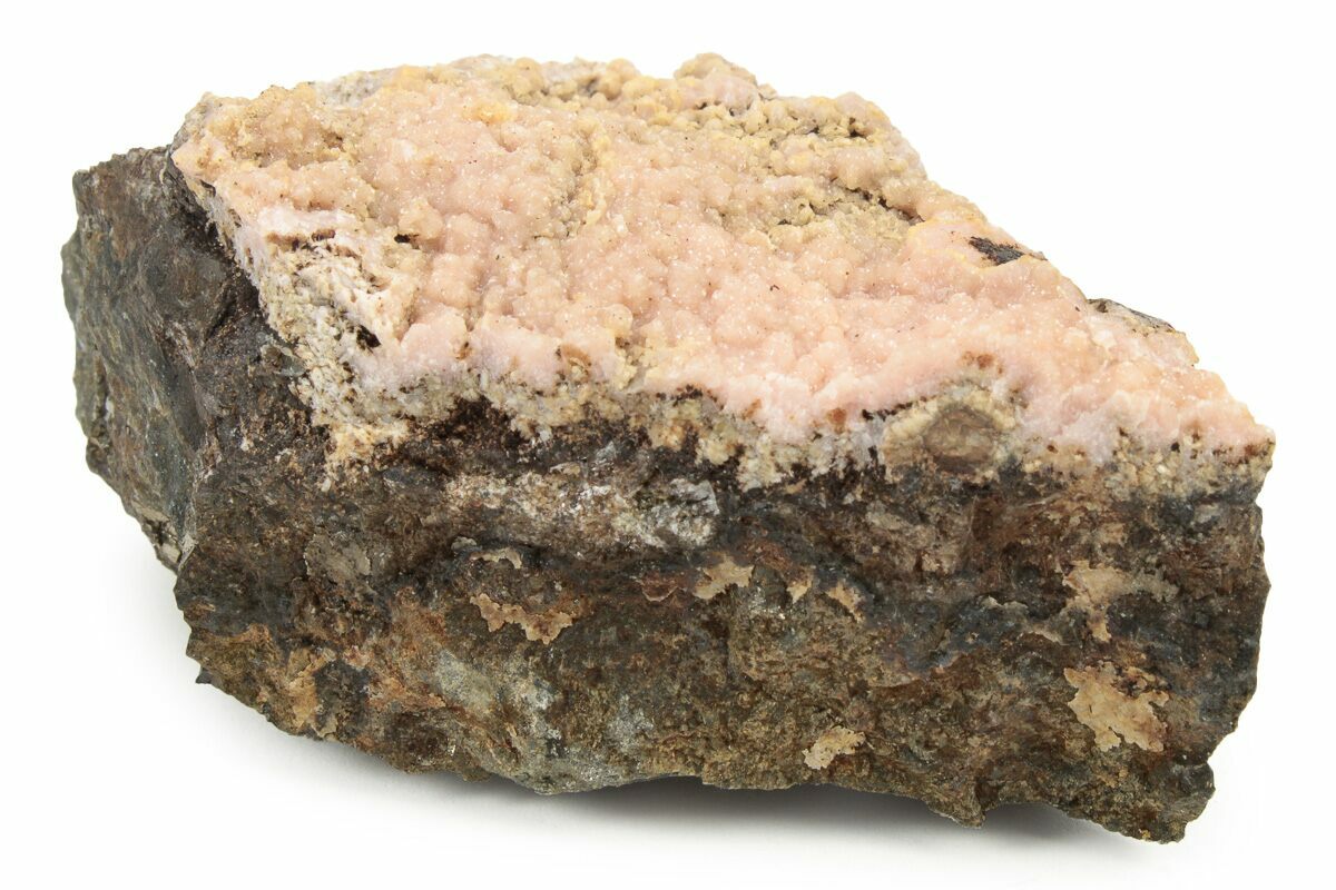 This is a gorgeous aggregations of sparkling rhodochrosite crystals that are tightly packed together, creating this salmon-pink botryoidal formation. The specimen was collected from the Santa Eulalia mining district of Chihuahua, Mexico and including the oxide matrix, measures 2.65" wide.