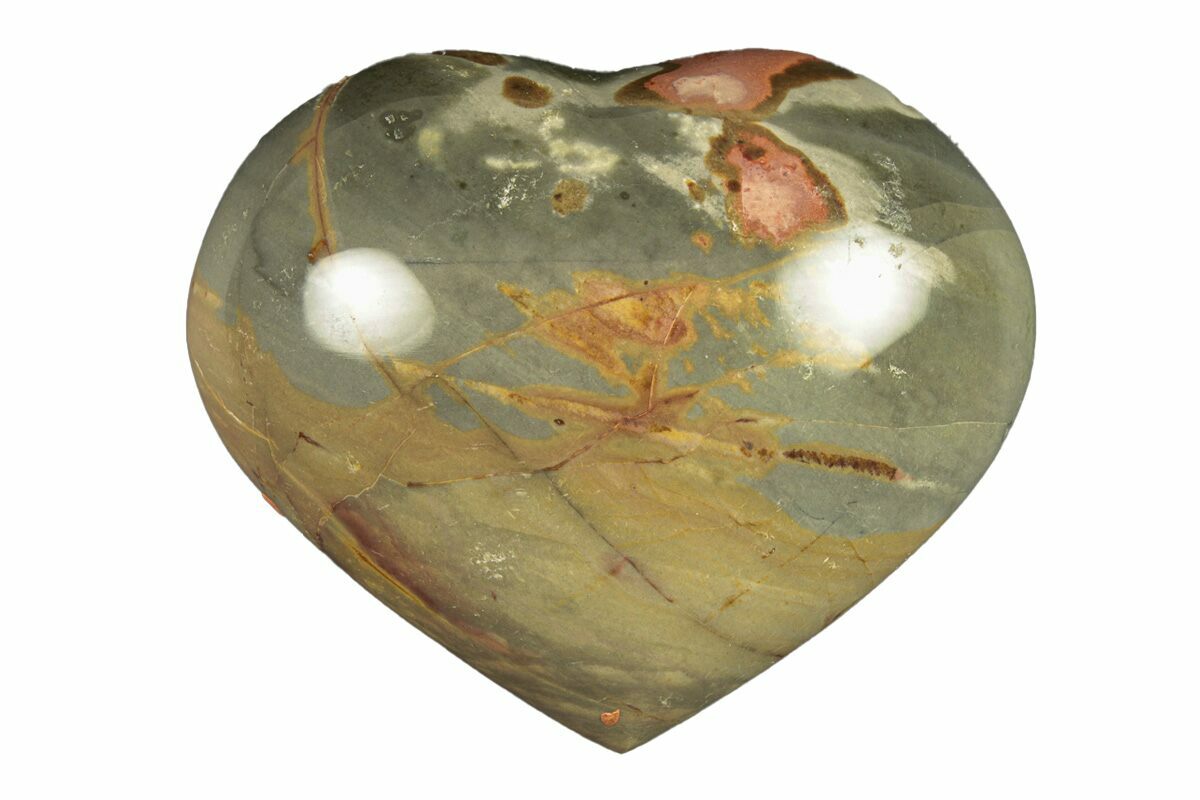 This is a beautiful, 2.65" wide hand polished piece of polychrome (picture) jasper found in the deserts of Madagascar. The specimen has been shaped and polished into the shape of a heart.