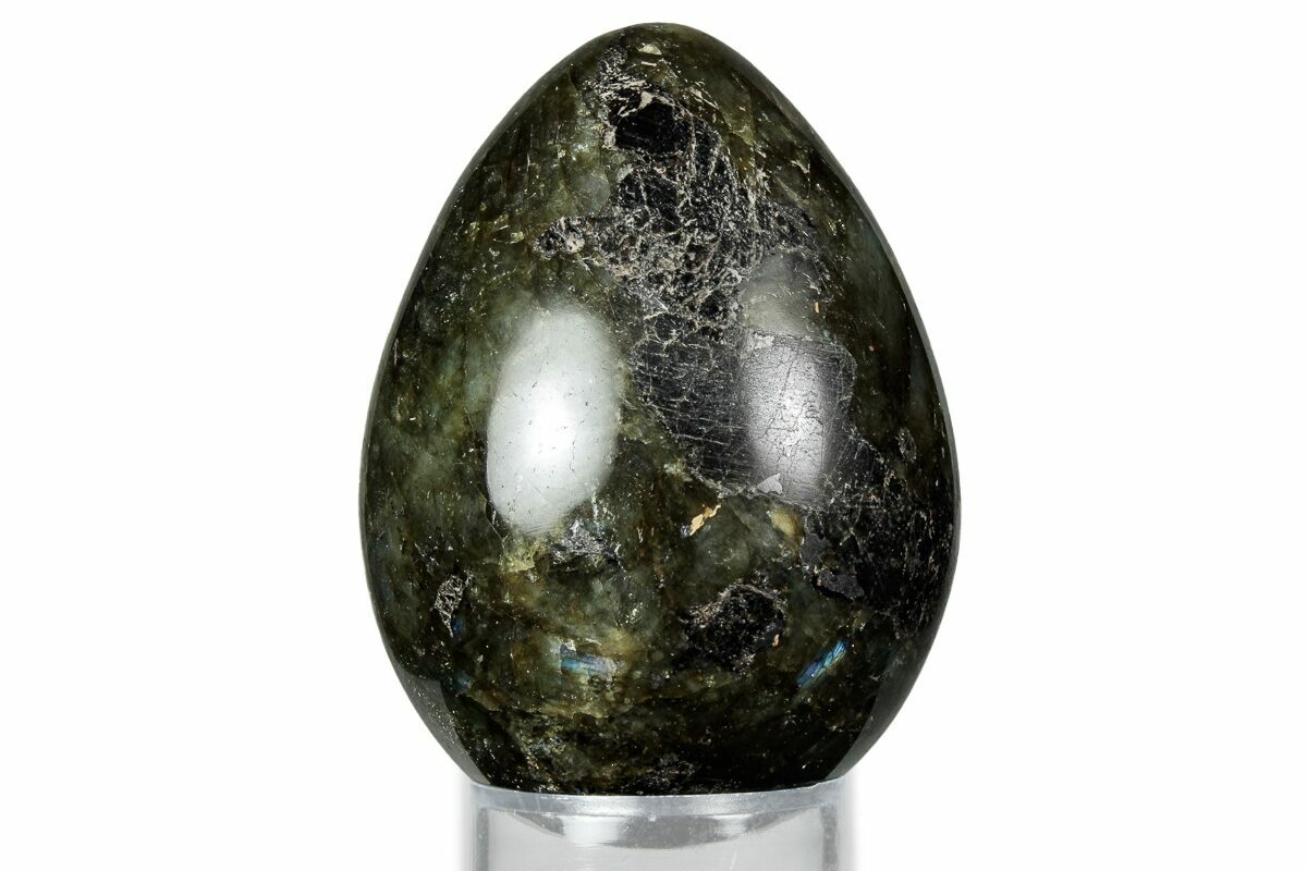 This is a 2.7" wide polished labradorite egg that bursts with vibrant flashes of blue, green, orange, and even purple when rotated under light. Its shifting color play gives the piece a unique character from every angle.