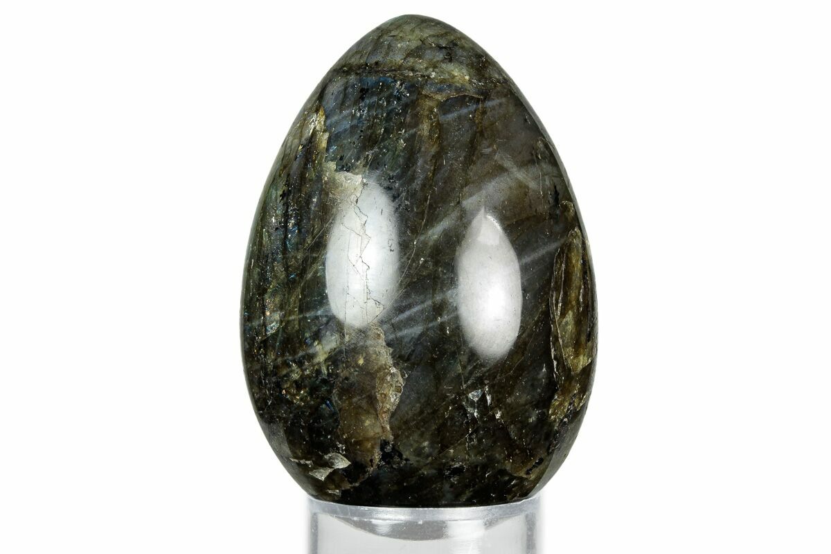 This is a 2.7" wide polished labradorite egg that bursts with vibrant flashes of blue, green, orange, and even purple when rotated under light. Its shifting color play gives the piece a unique character from every angle.