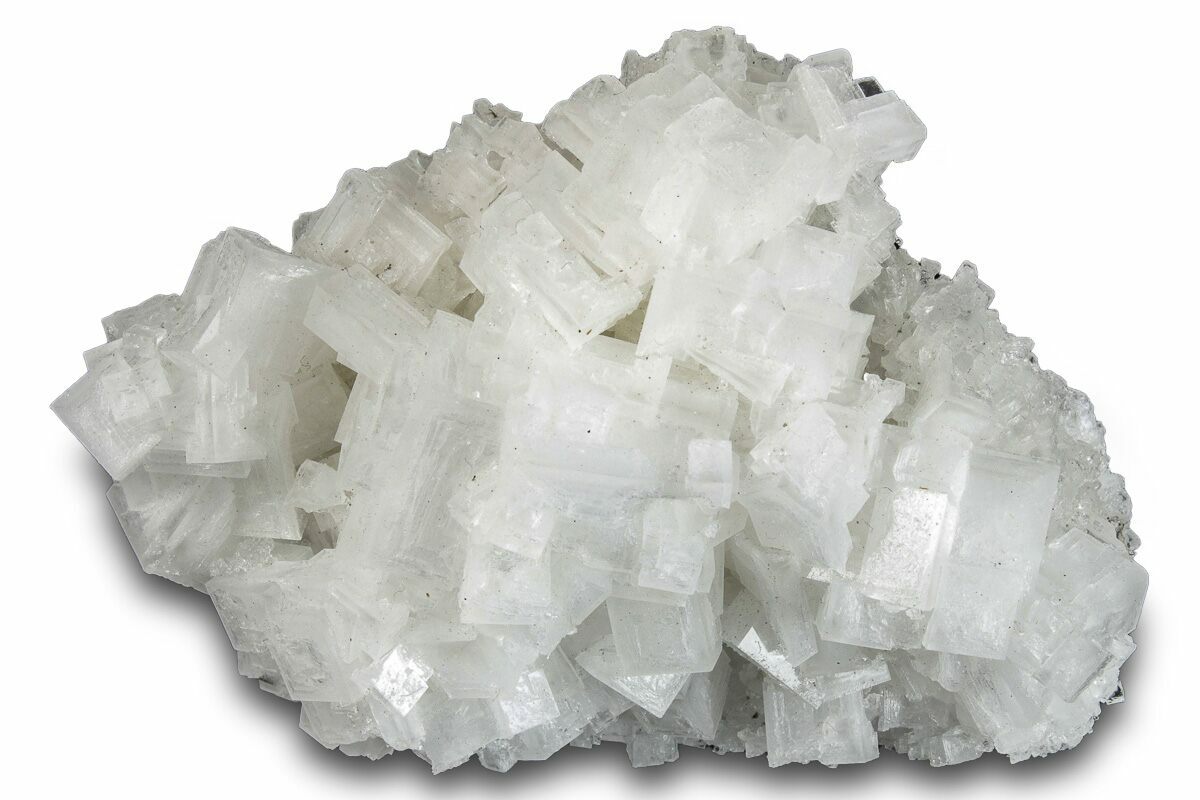 Halite, more commonly known as rock salt, is a form of the mineral sodium chloride (NaCl). It forms when salt-rich waters evaporate and can be colored by mineral impurities.
