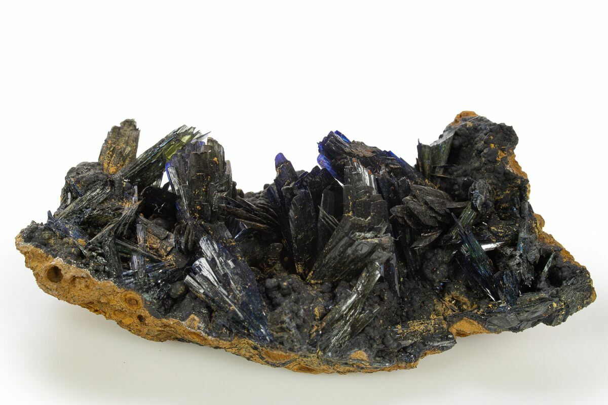 This is a cluster of glittering, very dark-green Vivianite crystals on an oolitic limonite matrix. The radiating crystals have good terminations and a lot of sparkle. These from the Kerchenskoe Mine on the Crimea Peninsula.