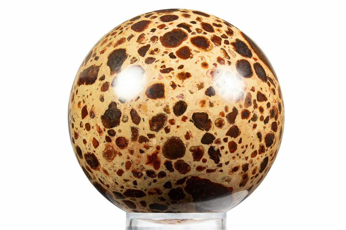 This is an incredible polished sphere made of bauxite (aluminum ore) mined in Russia. It is old collection material that was provided in its rough form and later polished to a glossy-finish. The polish brings out the spherical, red-brown ore bodies which contrast beautifully against the beige matrix. Seldom is this beautiful material found on the market.