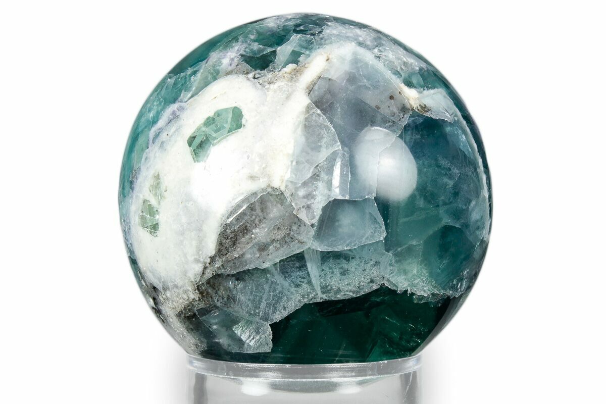 This is a 2.7" wide polished sphere made out of green and purple fluorite, mined in Mexico. The quality of the polishing is excellent and under shortwave UV, the fluorite fluoresces purple. Comes with the pictured display stand.