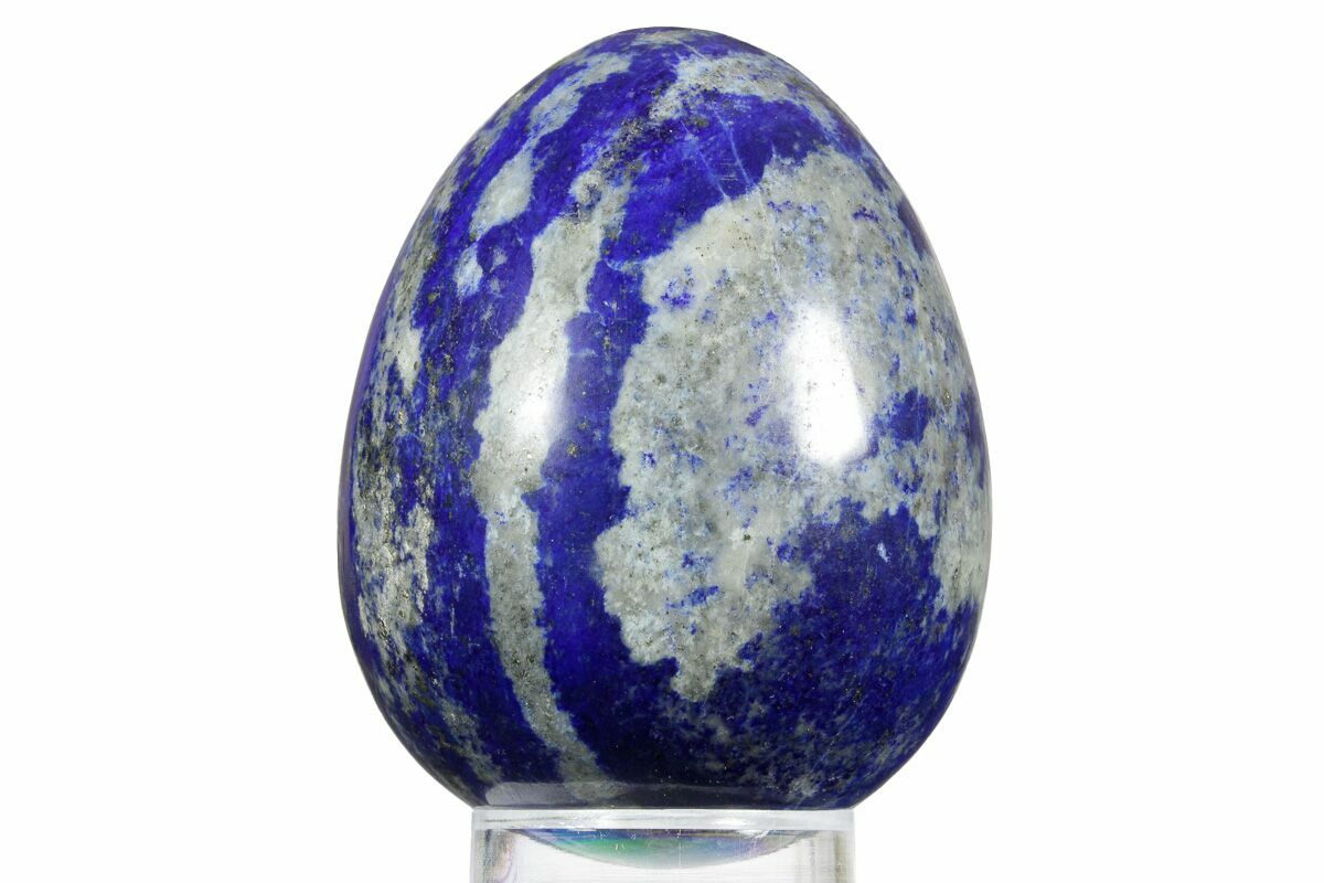 This is a 2.7" tall, polished lapis lazuli egg with streaks of sparkling pyrite running through it. The vibrant blue stone was mined from Northern Pakistan. It comes with the pictured display stand.
