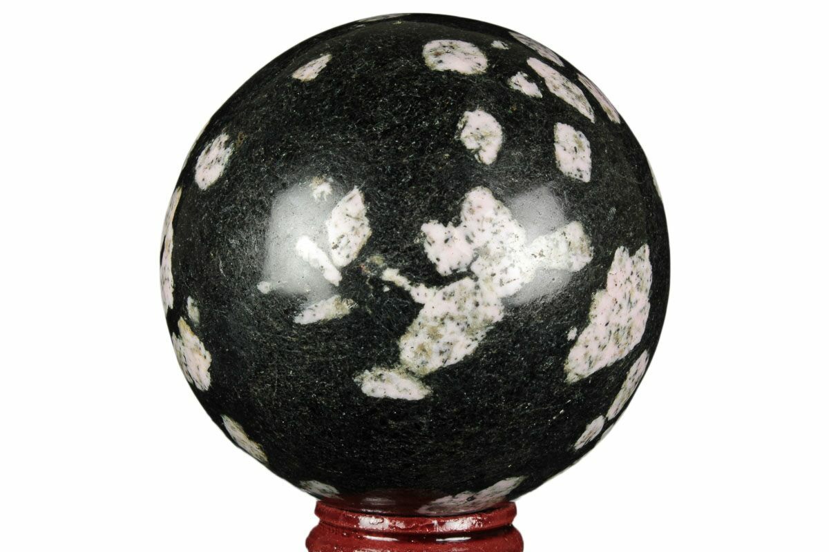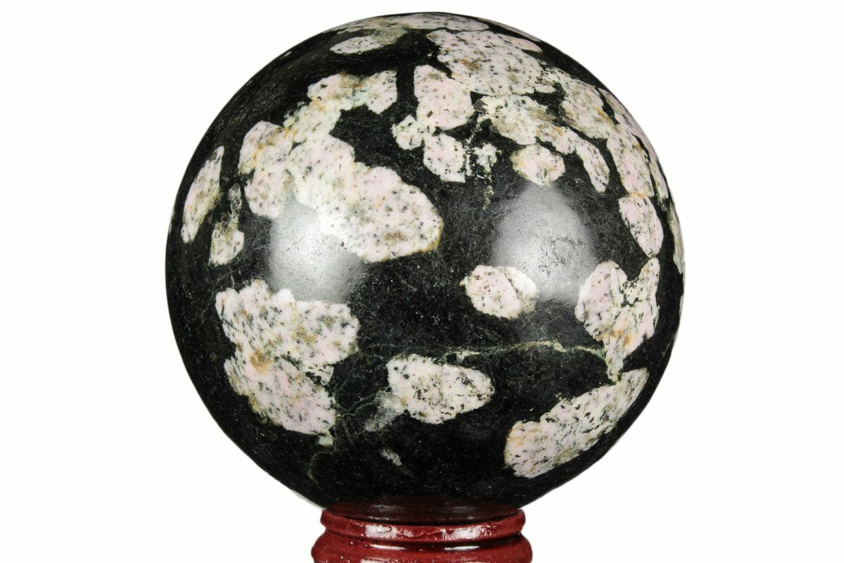 This is a 2.7" wide polished sphere made from Pakistan snowflake stone. It comes with a small acrylic ring stand.