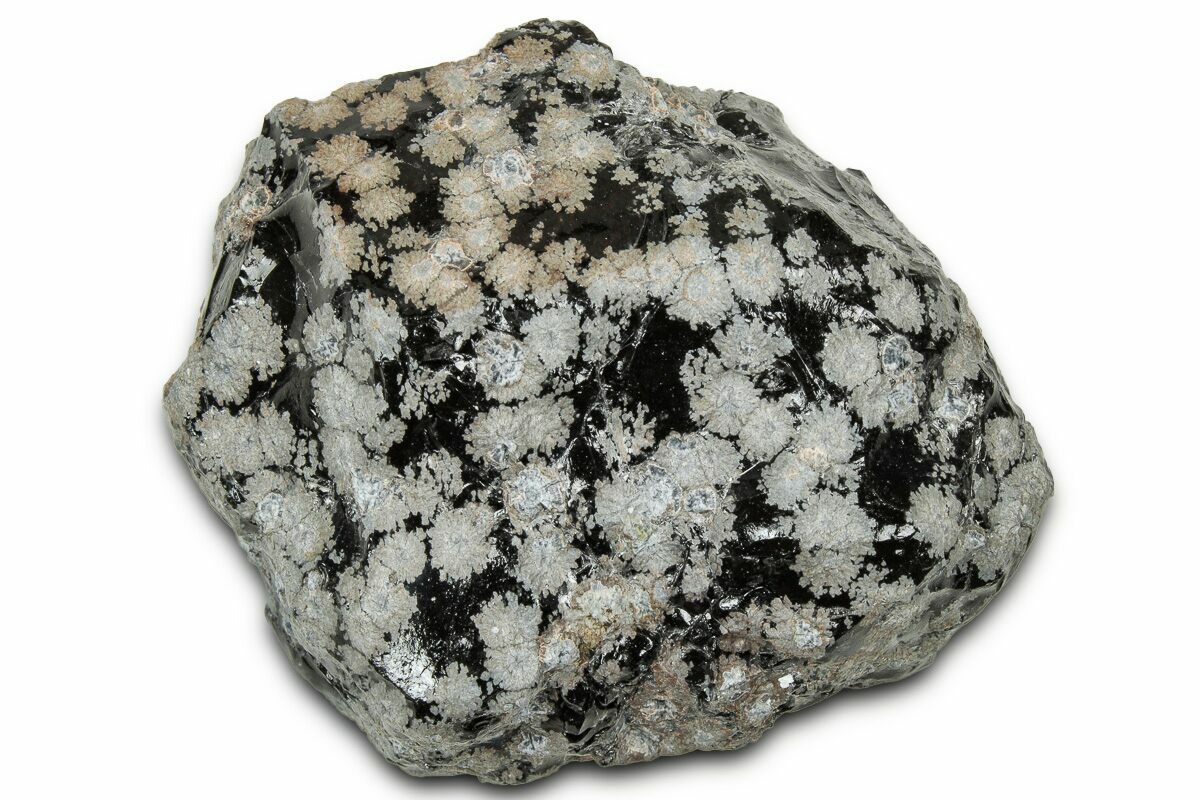 Snowflake obsidian is found near Sevier Lake in Millard County, Utah. It is a natural volcanic "glass" that forms when molten rock cools so quickly that that atoms do not have enough time to arrange themselves into crystals. Instead, the molten material solidifies into an amorphous solid called a glass. The "snowflakes" in the obsidian are small, white, radially clustered crystals of cristobalite, a mineral polymorph of silica.