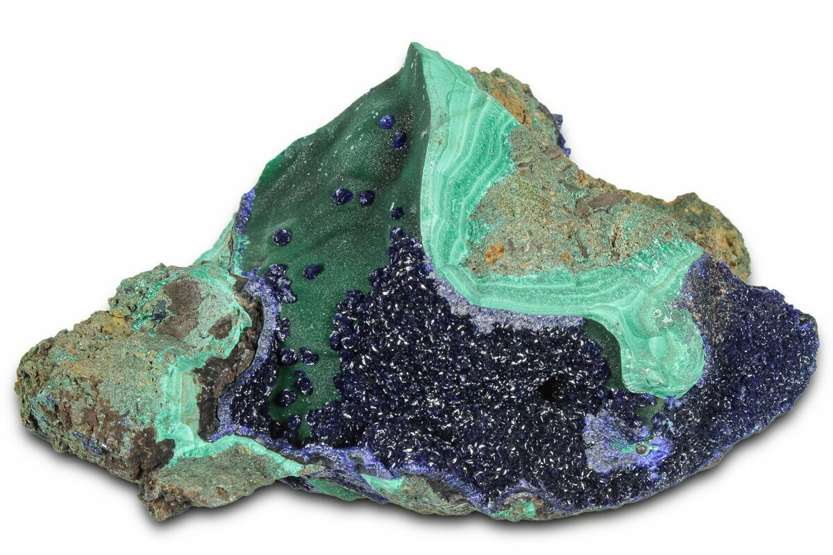 Azurite and malachite are two closely related copper minerals that frequently form together, creating some of the most striking natural color combinations found in the mineral world. Because their chemical compositions are so similar, only subtle changes in the environment during formation—especially the amount of water present—can influence which mineral becomes more dominant. Conditions with greater moisture tend to favor the development of malachite, while drier settings allow azurite to accumulate more readily.