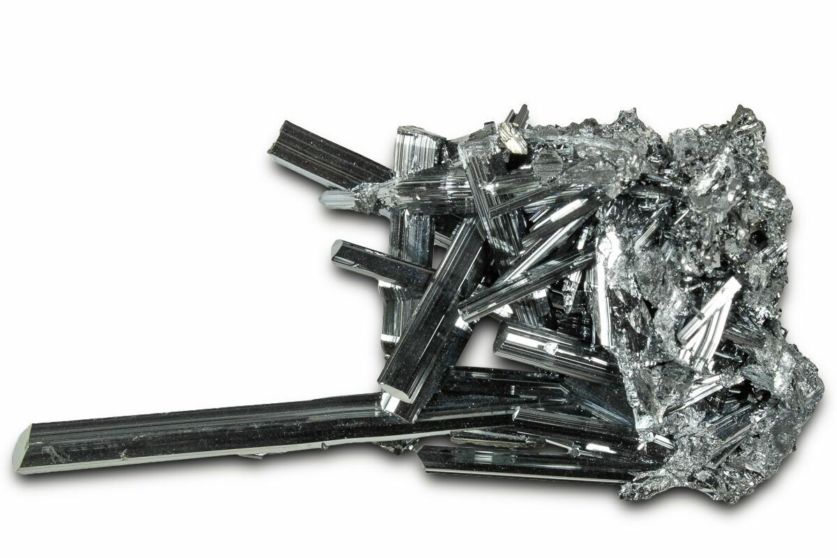 Stibnite is a striking mineral composed of antimony sulfide and is best known for its metallic luster and dramatic, elongated crystal formations. It often forms slender, prismatic crystals that can cluster into stunning radiating or parallel groups. Its color ranges from silvery-gray to steel-blue, with a reflective sheen that enhances its visual appeal. Stibnite is relatively soft, with a Mohs hardness of 2, making it easy to scratch but still prized for its aesthetic qualities.