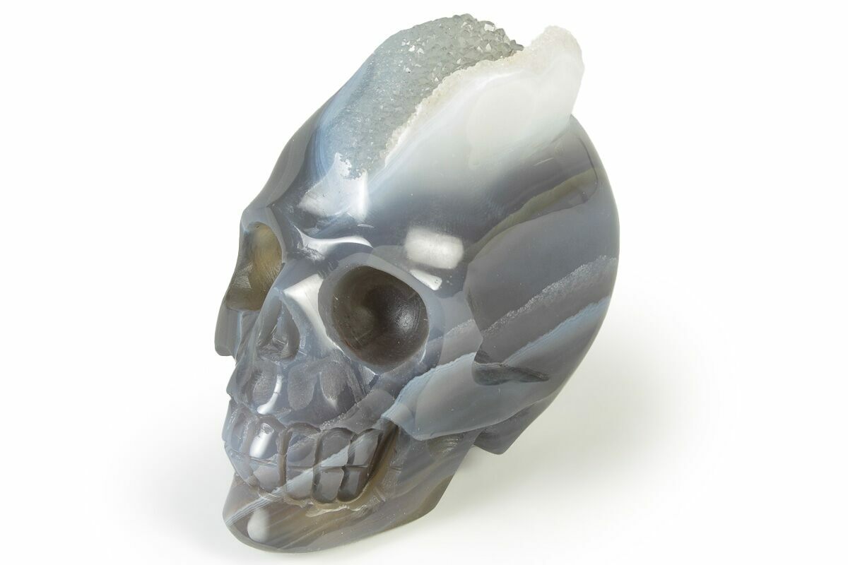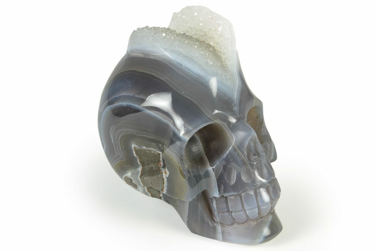 This is a gorgeous, 2.75" long, polished agate skull that contains a quartz crystal encrusted cavity at the top of the skull. This specimen has undergone intricate sculpting and polishing that left the crystal in the shape of a skull.
