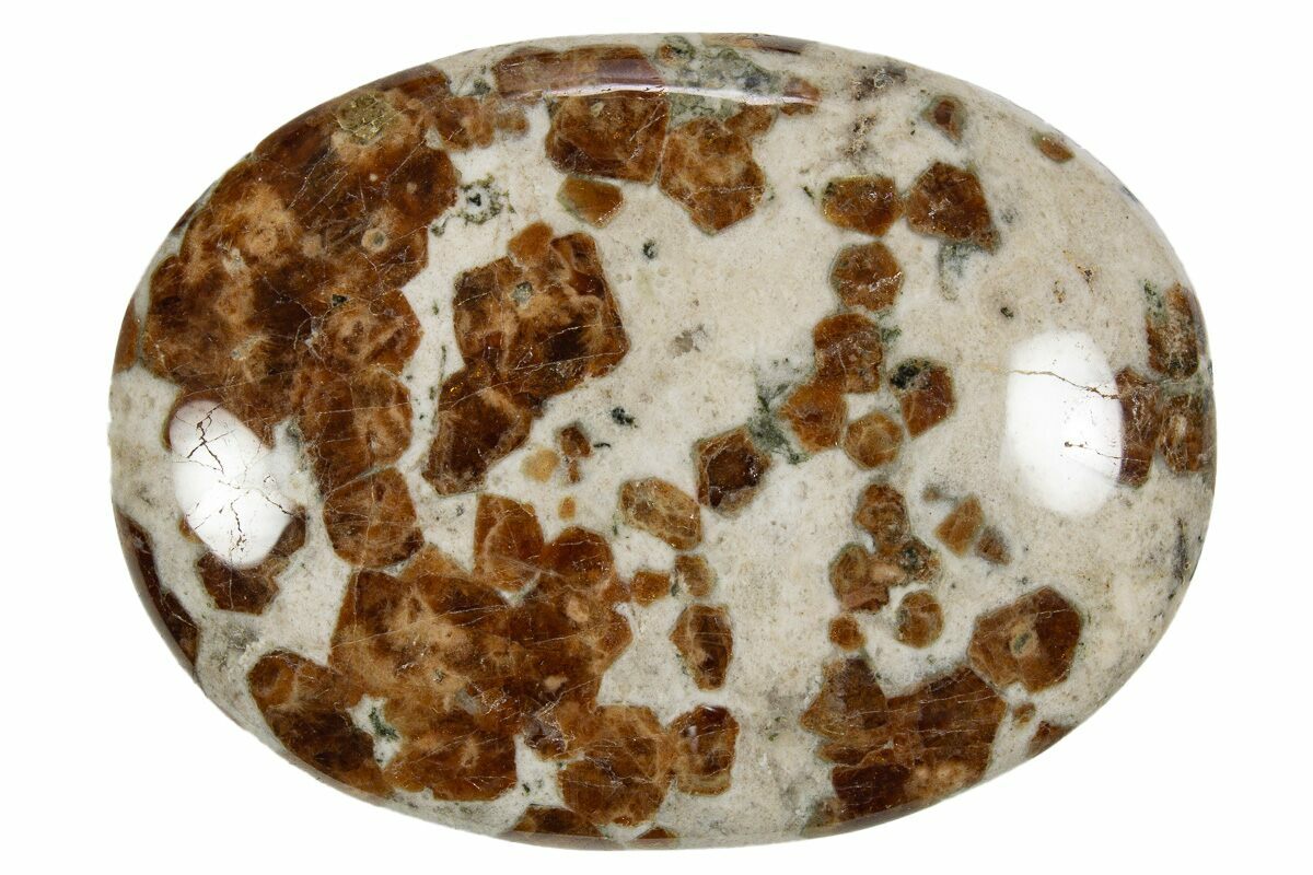 This is a 2.75" wide polished palm stone featuring vivid orange grossular garnets dispersed through a creamy white wollastonite matrix. Collected in Namibia, the material takes an excellent polish that highlights the contrasting textures—the translucent to semi-translucent garnet crystals set against the silky, fibrous sheen of the wollastonite host rock.