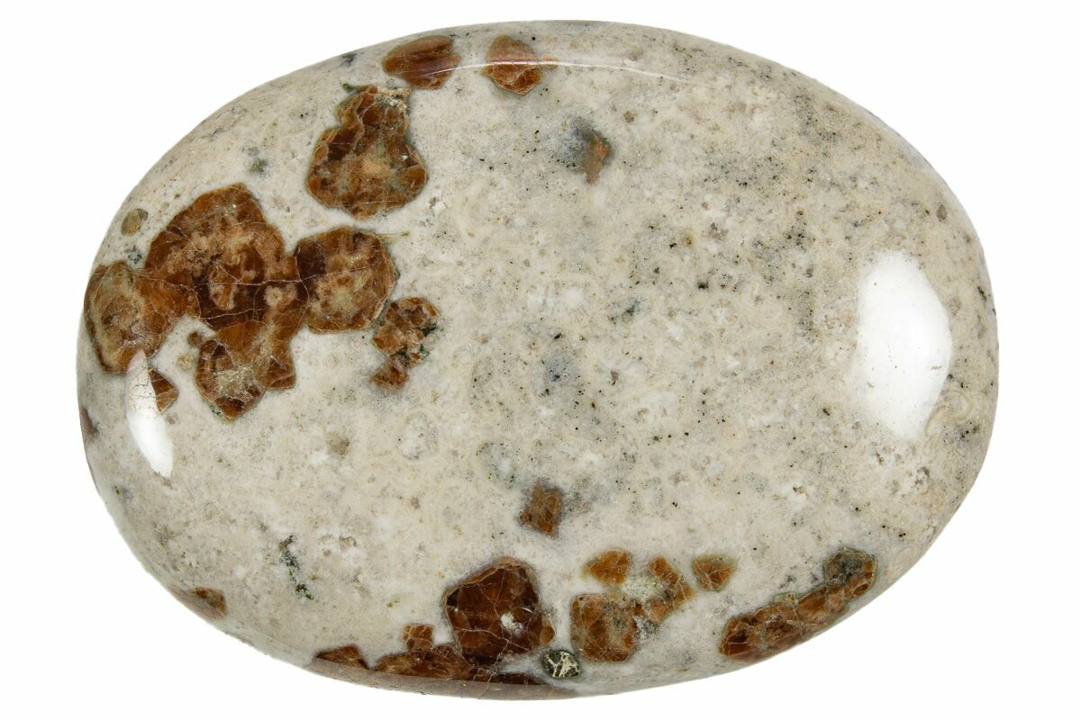 This is a 2.75" wide polished palm stone featuring vivid orange grossular garnets dispersed through a creamy white wollastonite matrix. Collected in Namibia, the material takes an excellent polish that highlights the contrasting textures—the translucent to semi-translucent garnet crystals set against the silky, fibrous sheen of the wollastonite host rock.