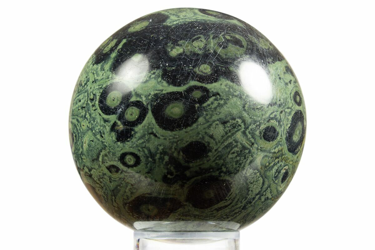 This is a beautiful hand polished sphere made from kambaba jasper found in Madagascar. It is 2.75" wide and has dark circular mineral formations throughout the green matrix.