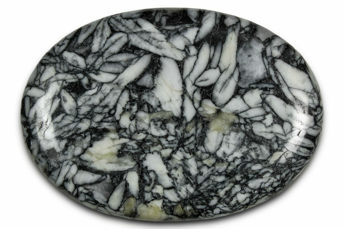 This is a 2.75" wide polished Pinolite palm stone from Austria, featuring the distinctive white “pine-nut” magnesite inclusions dispersed through dark gray dolomite.