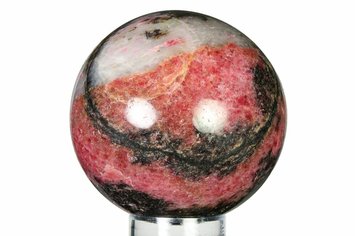 This is a beautiful, 2.75" wide, polished sphere of rhodonite from Ampanihy, Madagascar. The black veins that interrupt the pink rhodonite stone are manganese oxide. It comes with an acrylic ring display stand.