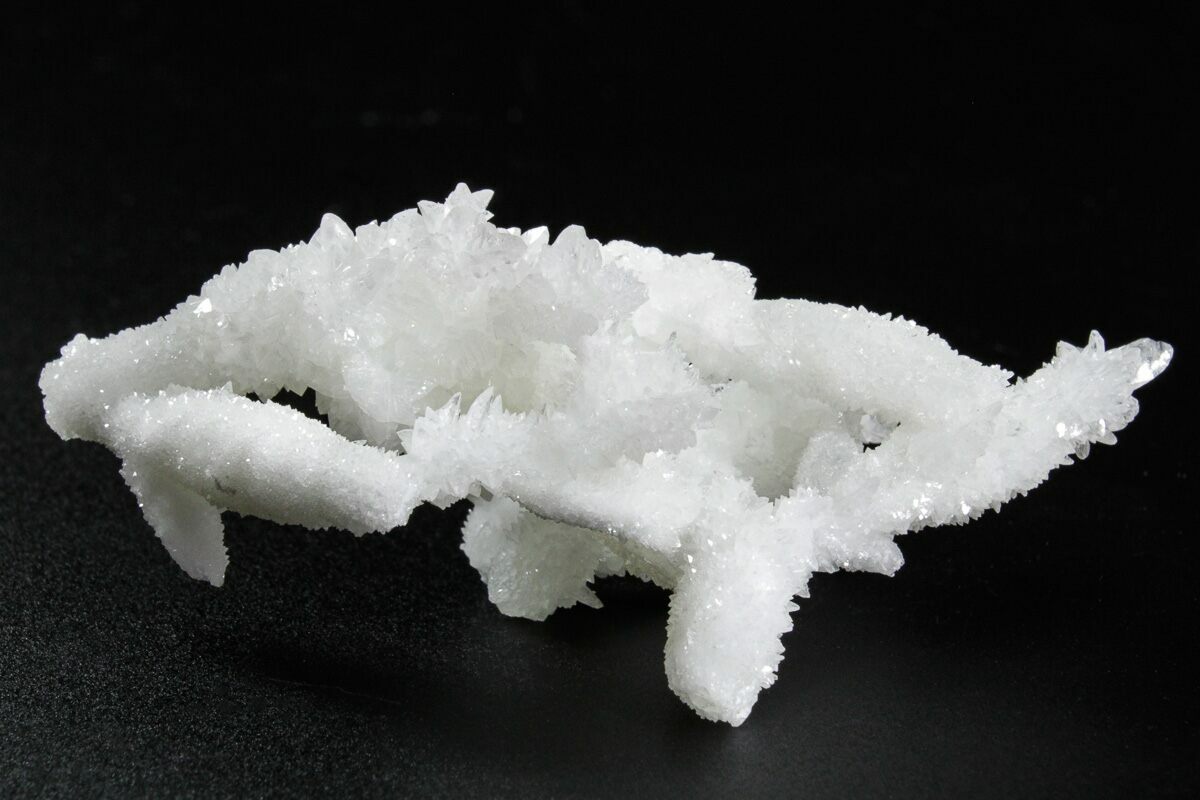 Cave calcite forms underground due to groundwater deposition. While it often forms stalactites and stalagmites on cave ceilings and floors, it can also form as unique, branching, tree-like structures. These beautiful formations are sometimes known as ‘floss ferri’ (flowers of iron) and frostwork.