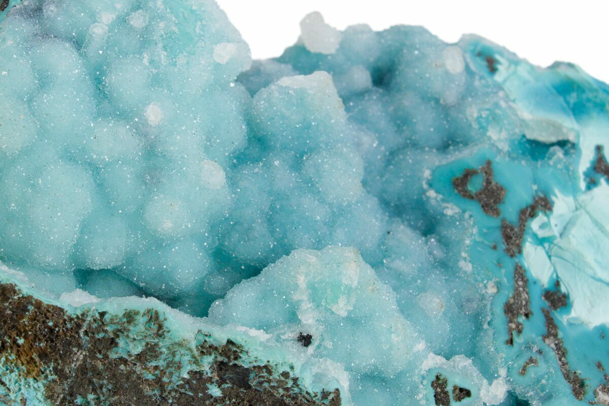 Regularly, chrysocolla will form as botryoidal lumps and spheres, rarely forming visible crystals. It can also form in both solid and fibrous veins, over fibrous minerals, and in crusts. Known for its sharp and vibrant coloring, chrysocolla can display a wide variety of colors such as bluish-green, bright green, light blue, to even sometimes multicolored specimens depending on the atmosphere present during formation.