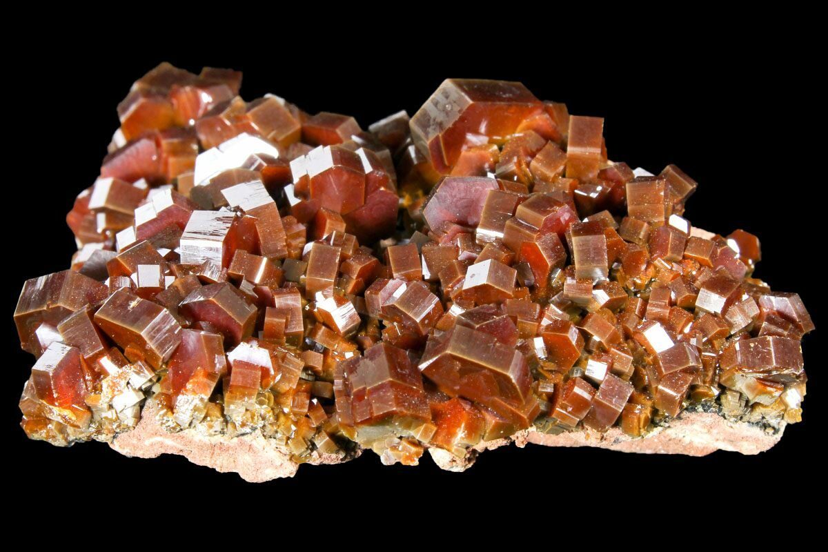 This is a beautiful aggregation of large, undamaged deep red vanadinite crystals from Midelt, Morocco. They exhibit excellent color saturation, and a mirror luster on matrix. The largest vanadinite crystal on this specimen is over .4" wide!