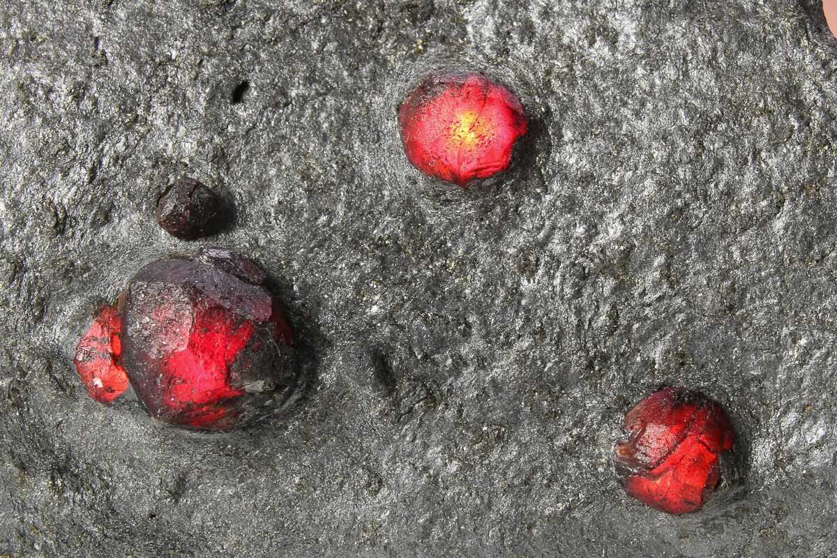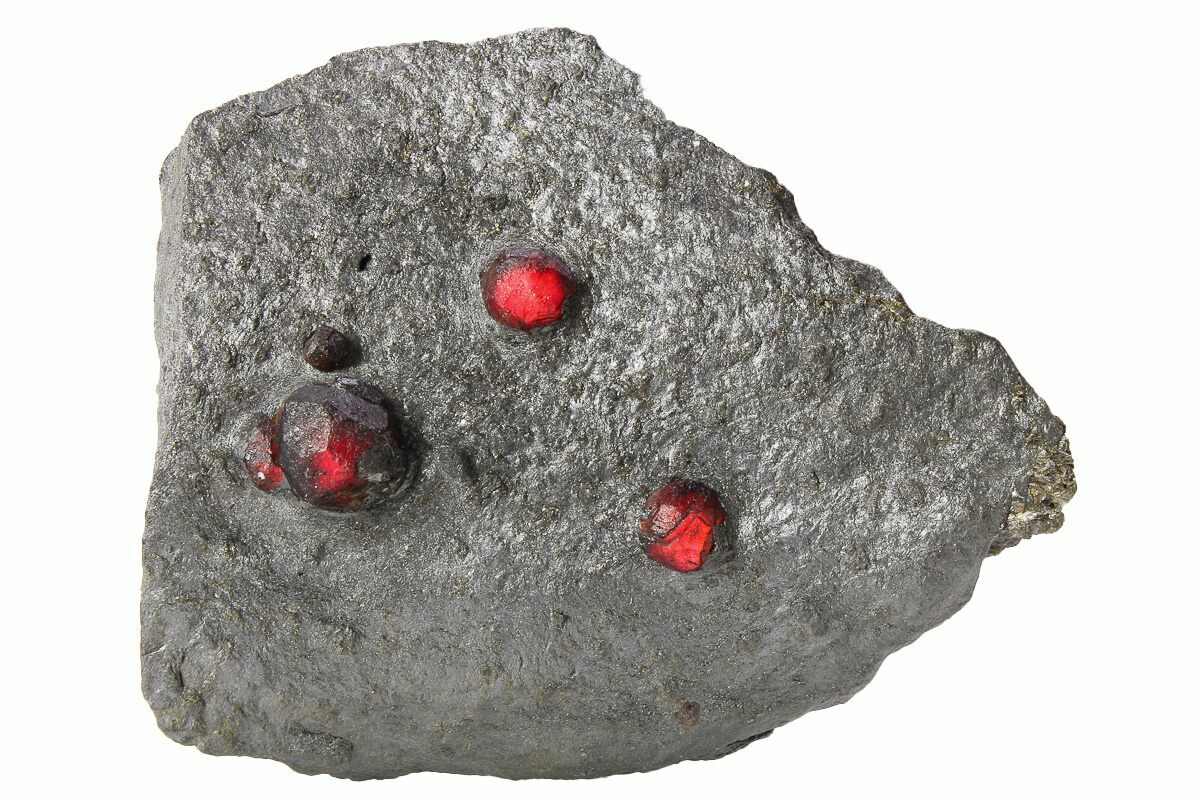 2.8" Plate of Three Red Embers Garnets in Graphite - Massachusetts