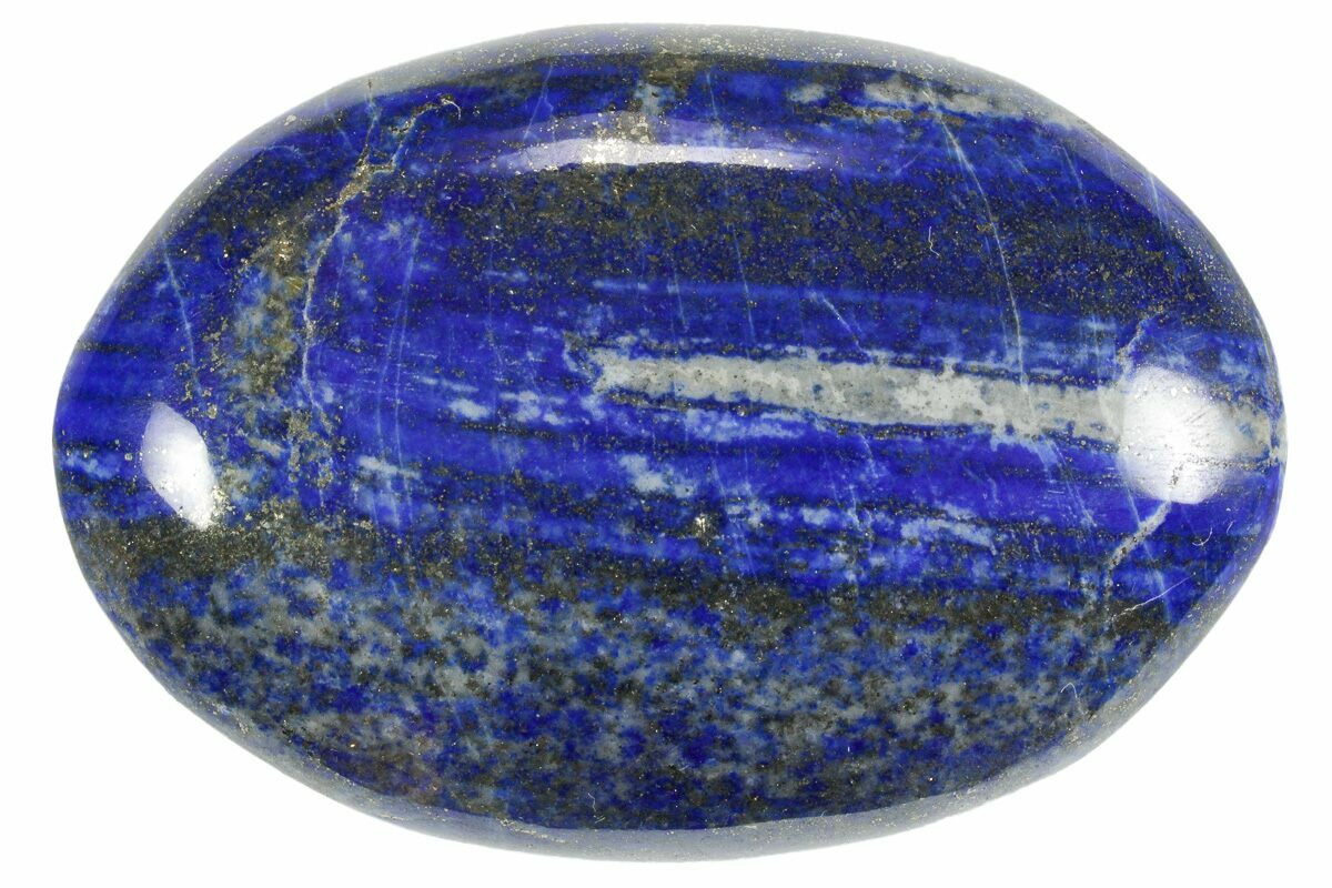 This is a 2.8" wide, polished lapis lazuli palm stone with streaks of sparkling pyrite running through it. The vibrant, blue stone was mined in Northern Pakistan.